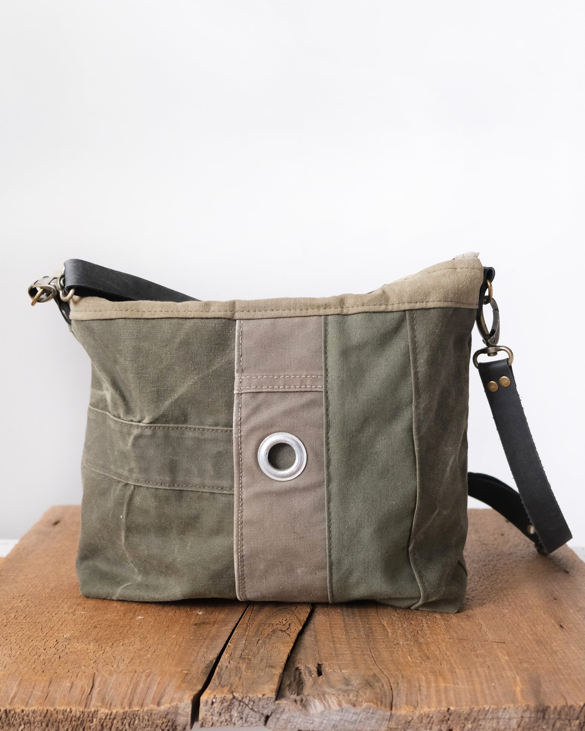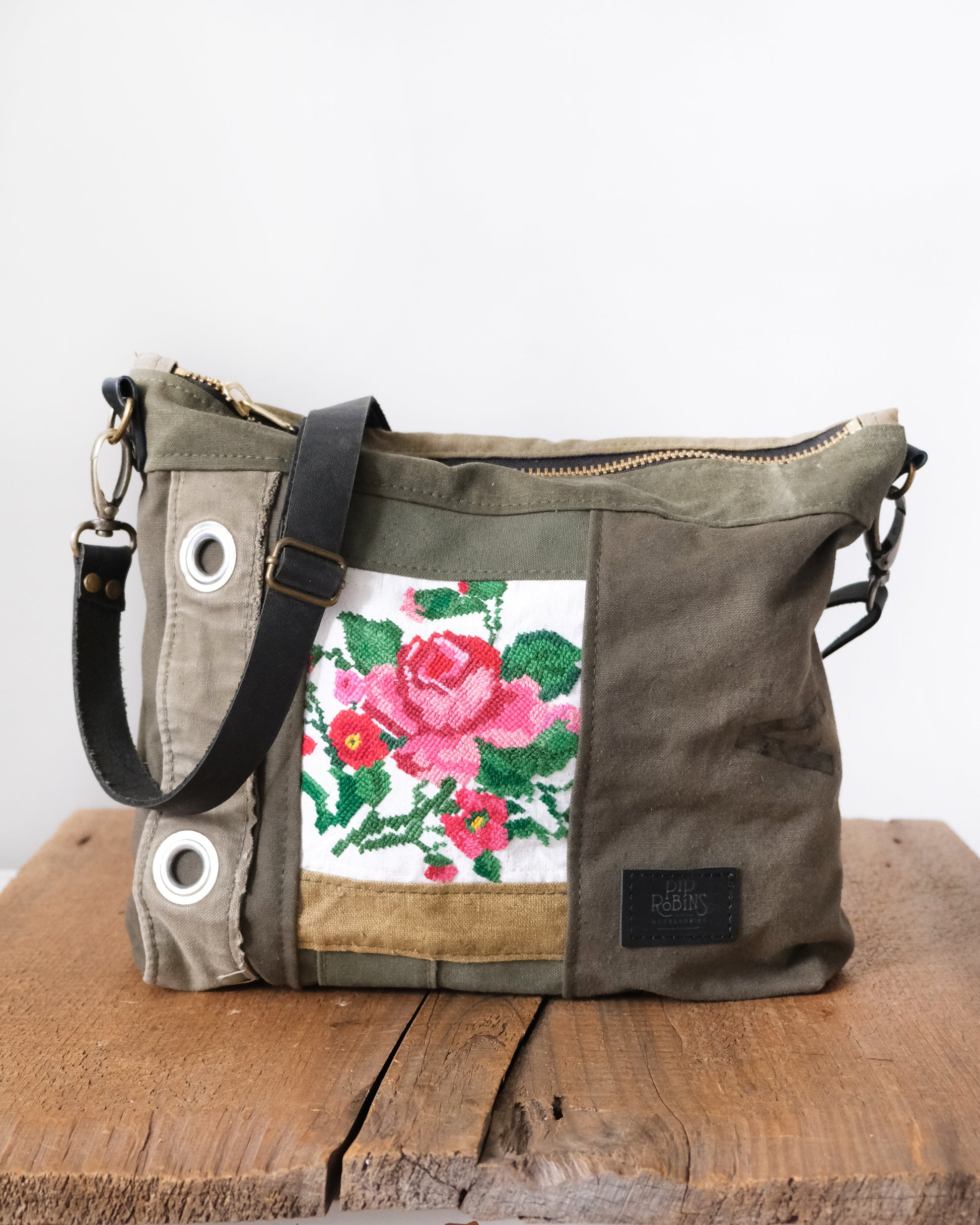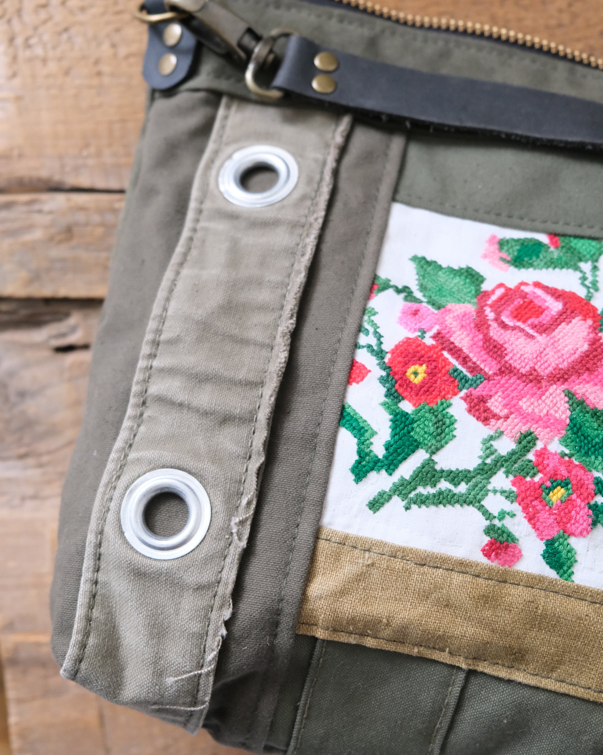 This one of a kind day bag is the perfect size for a purse, crafted with expert care from multiple vintage military duffle bags and featuring a piece of cross stitched flowers. Carry your phone, wallet, keys, tablet, book, and more - this bag is more than up to the task!