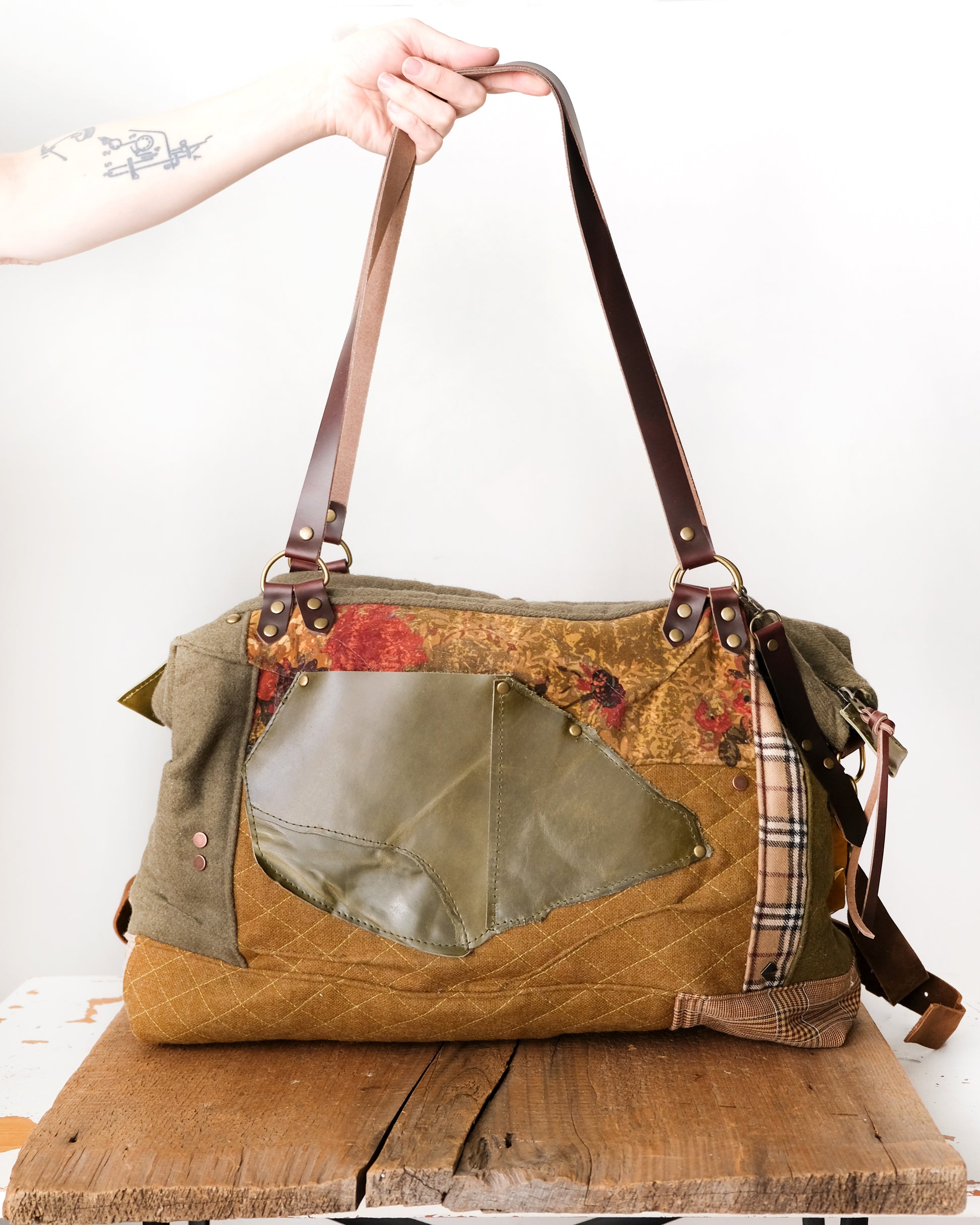 Crafted with layered textures and warm, natural hues, the Heritage Tote brings together quilted wool and leather in a design that's both practical and refined. Its generous capacity accommodates your essentials without excess weight, while subtle studded details enhance its understated appeal. Four interior slip pockets keep your items organized and within reach throughout your day. From weekend trips to everyday adventures, this tote delivers reliable functionality paired with timeless elegance that grows more beautiful with use.