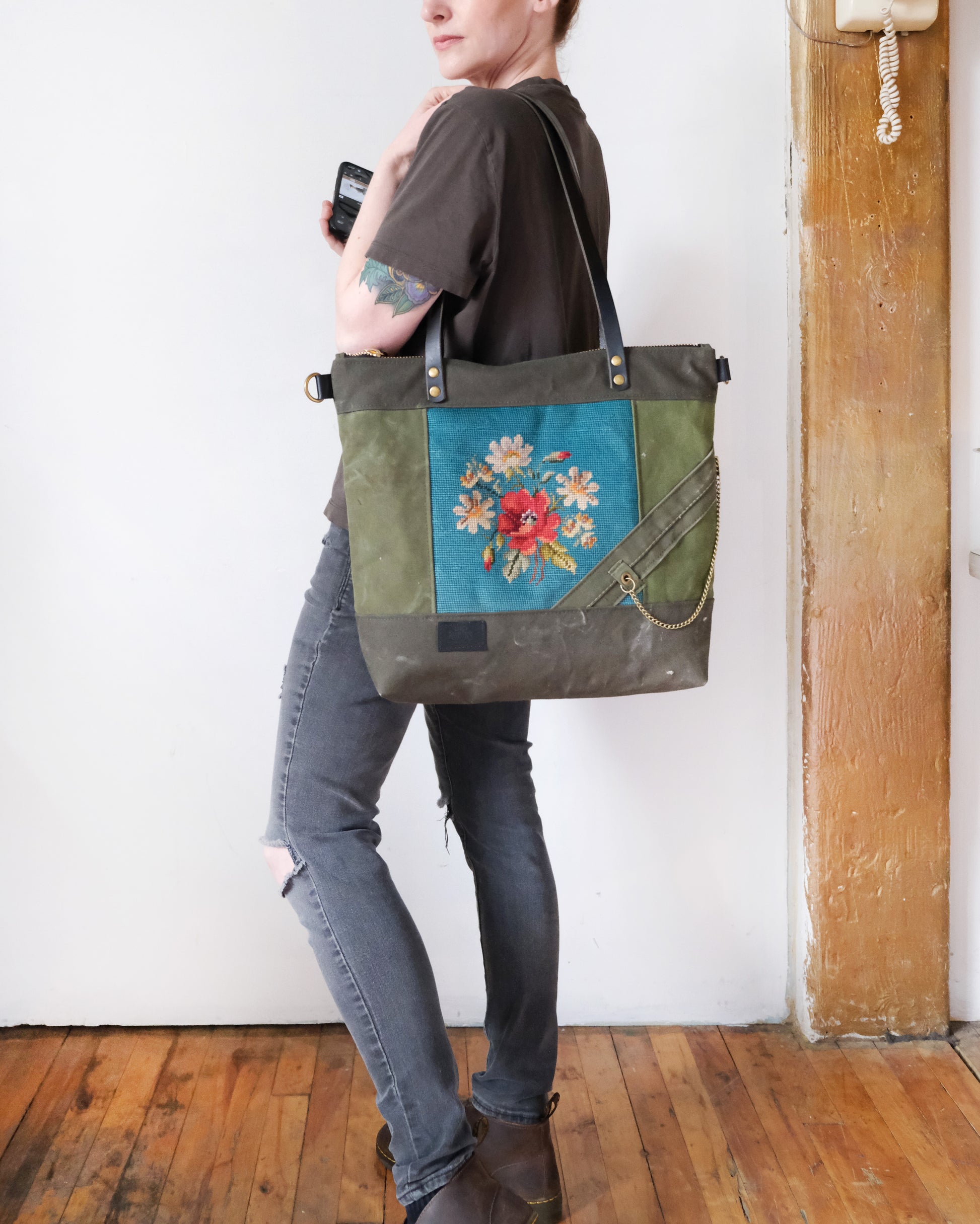 Carry a piece of history that's entirely one of a kind. This special Heritage Tote is handcrafted from authentic antique floral needlepoint and patch worked military surplus canvas. Plenty of room for your 13" laptop and a convenient exterior pocket - perfect for work, wanderings, and everything in-between.
