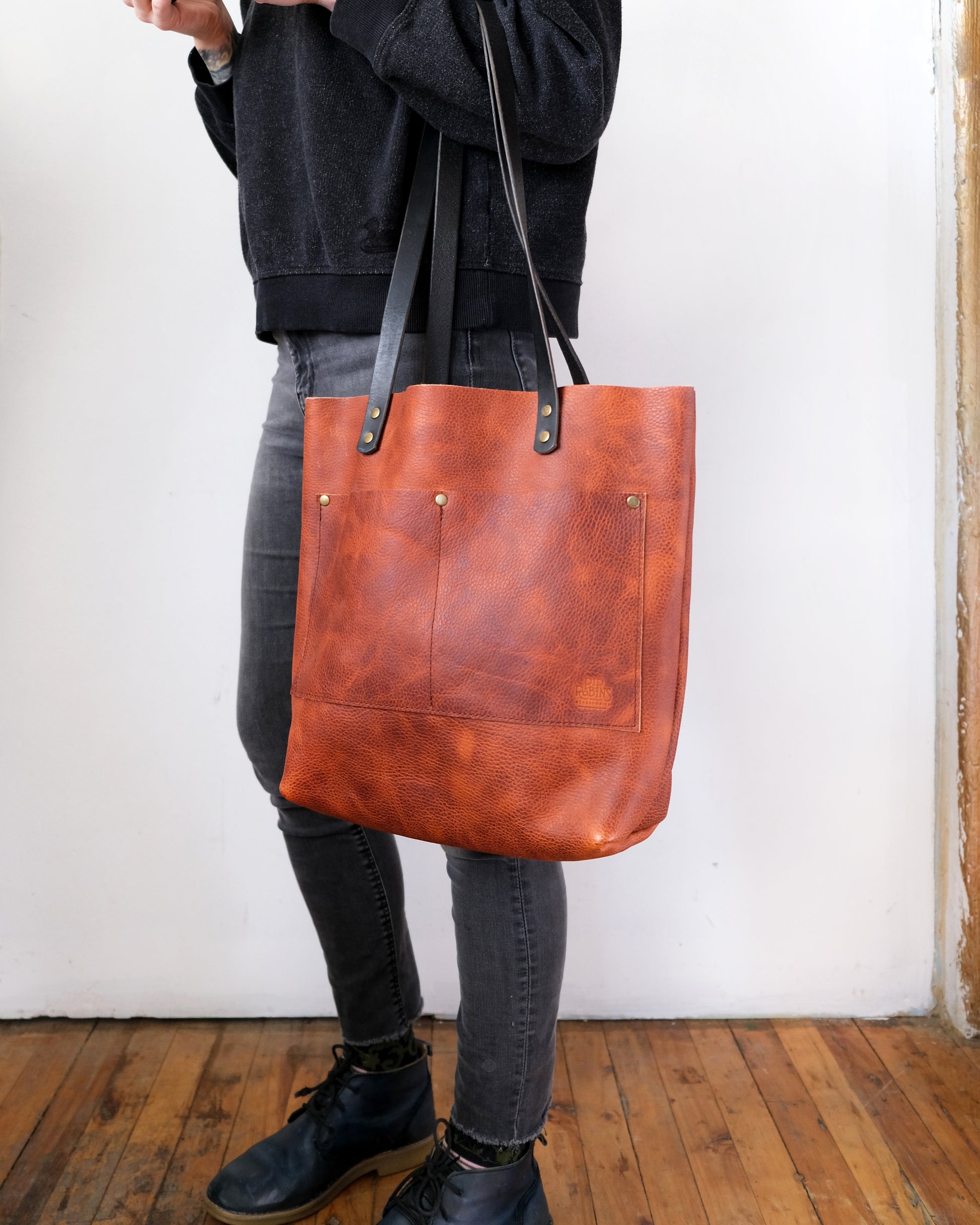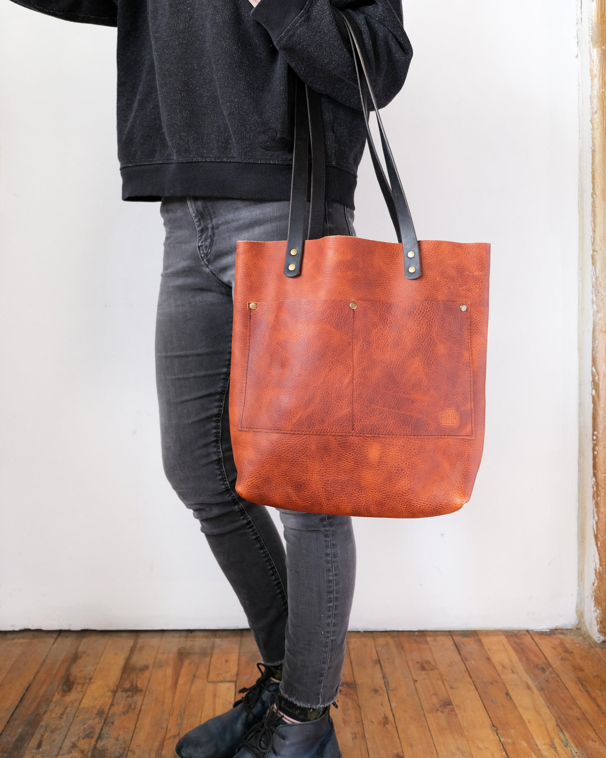 - Longer black water buffalo leather handles to easily slip over your shoulder