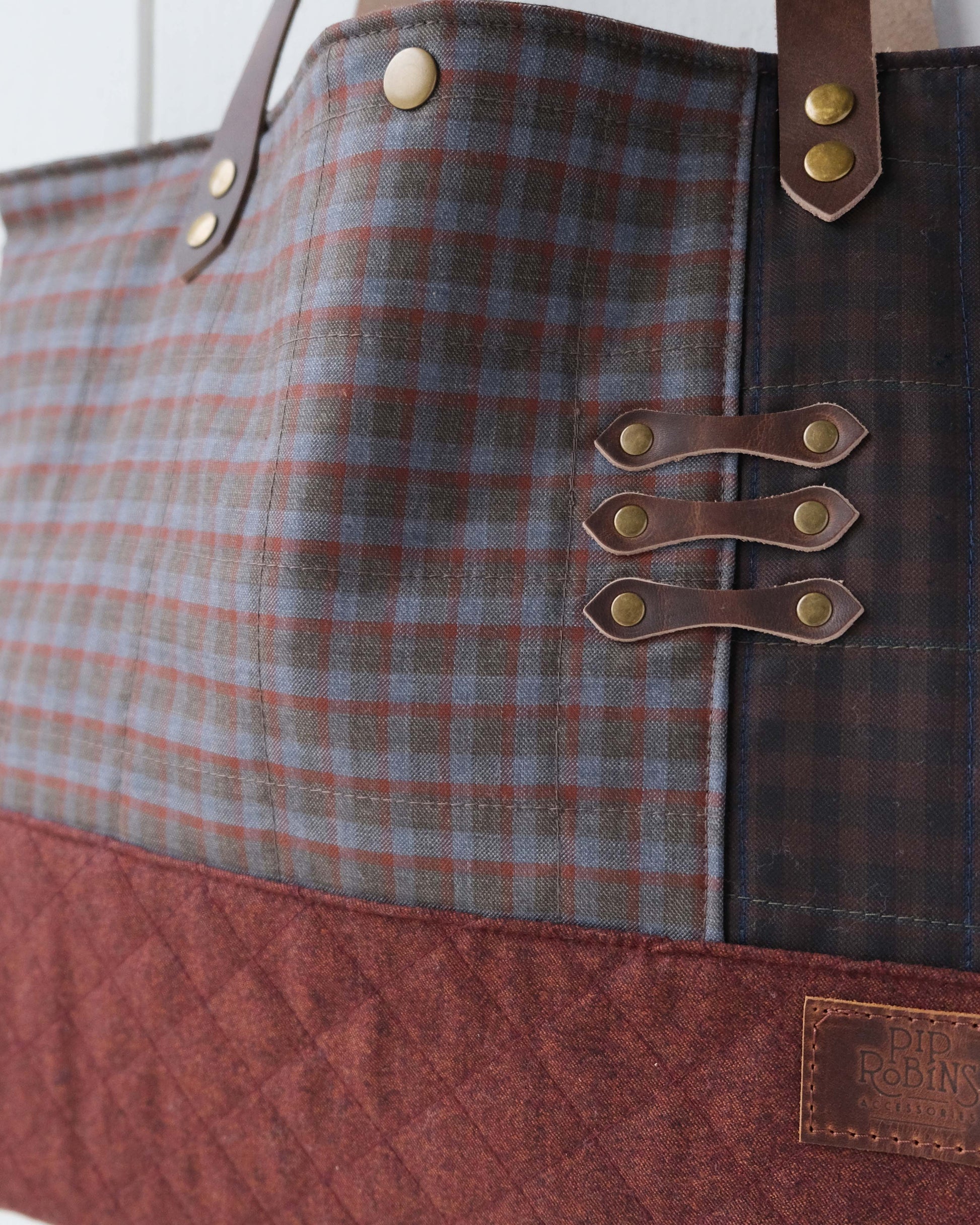 Introducing the brand new Anne Tote! This oversized bag is perfect for overnight trips or a roomy work bag. Each tote is one of a kind, and is made with beautiful wool and leather handles. Each individual textile has been quilted and paired together, and the leather and brass detailing make this bag super special. Plus, three interior pockets help keep you organized.
