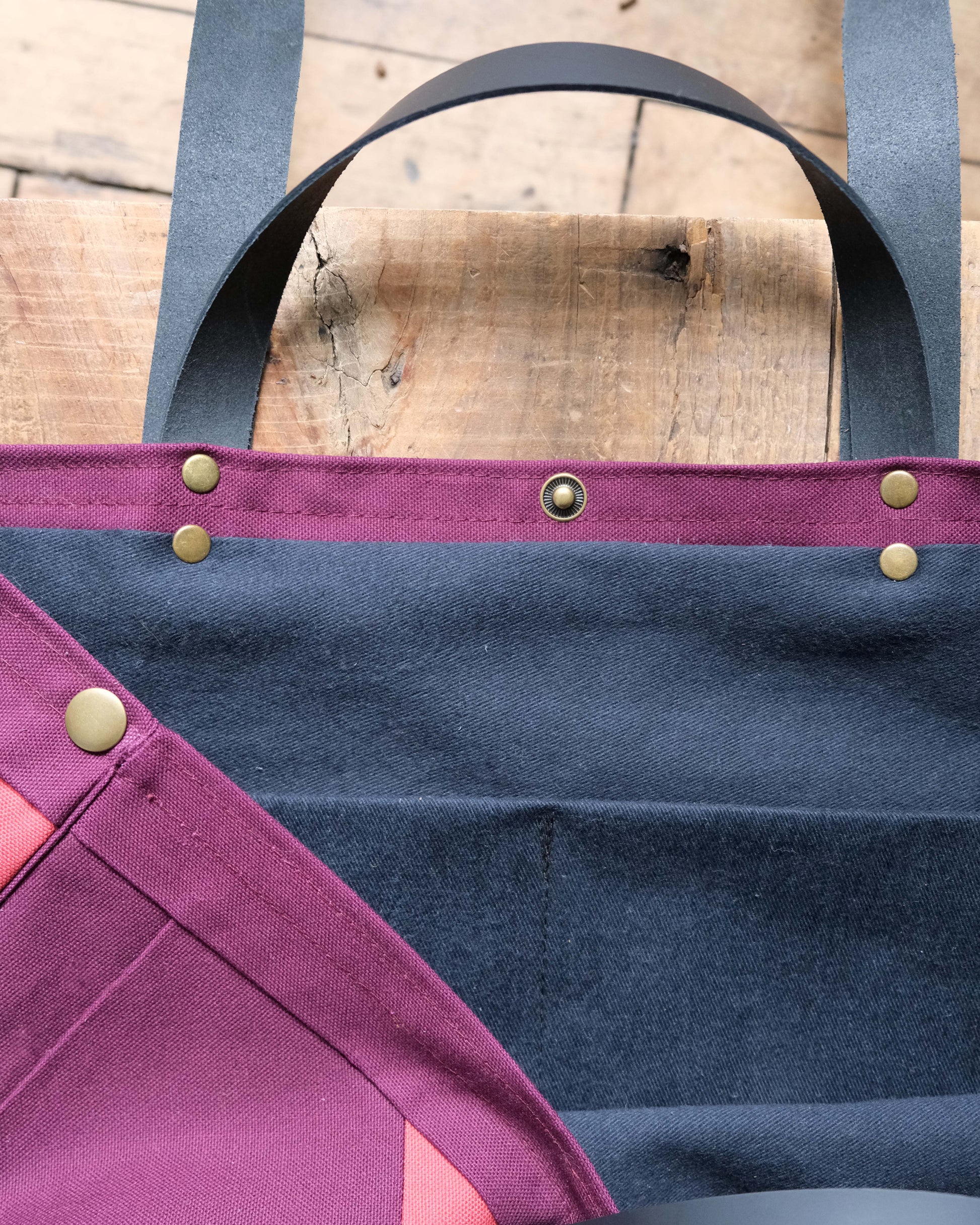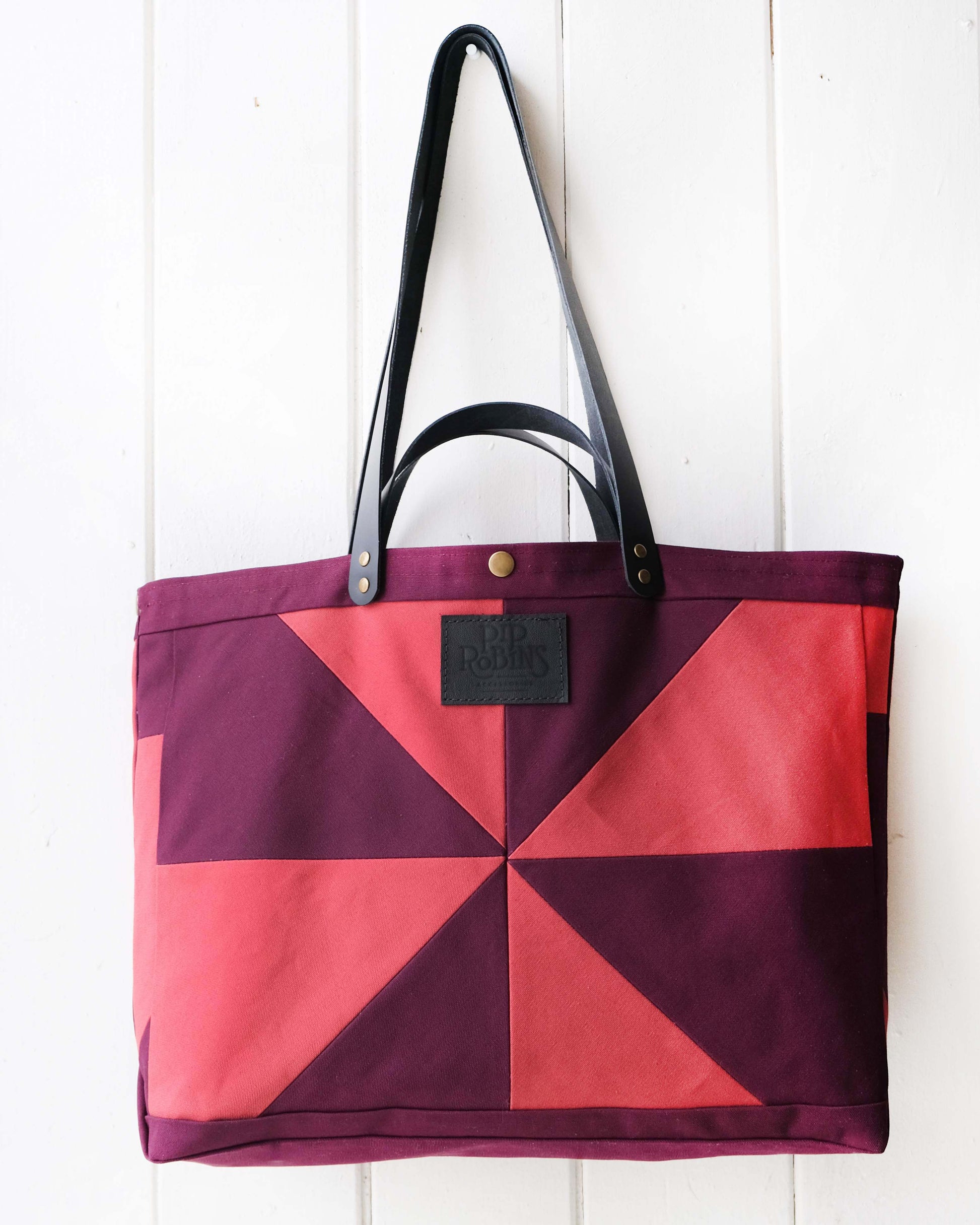 A beautiful, one of a kind canvas Mini-Mini Maggie Bag constructed from two different canvas colours (strawberry and eggplant), artfully pieced together.