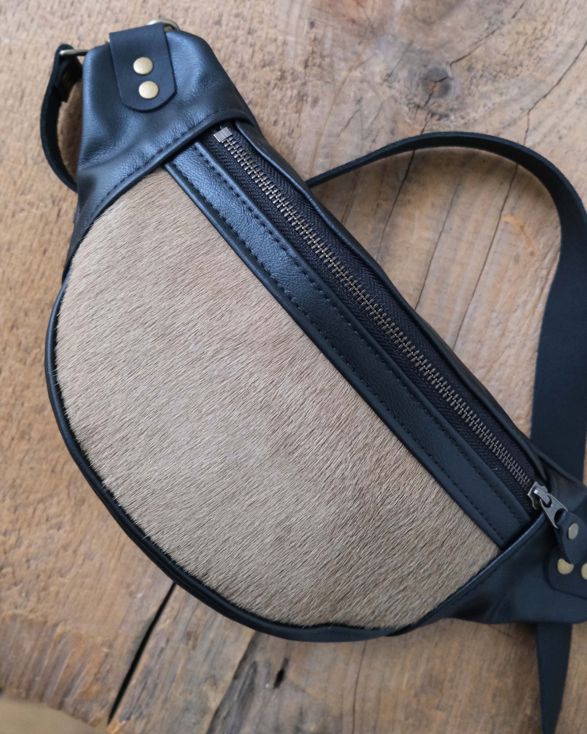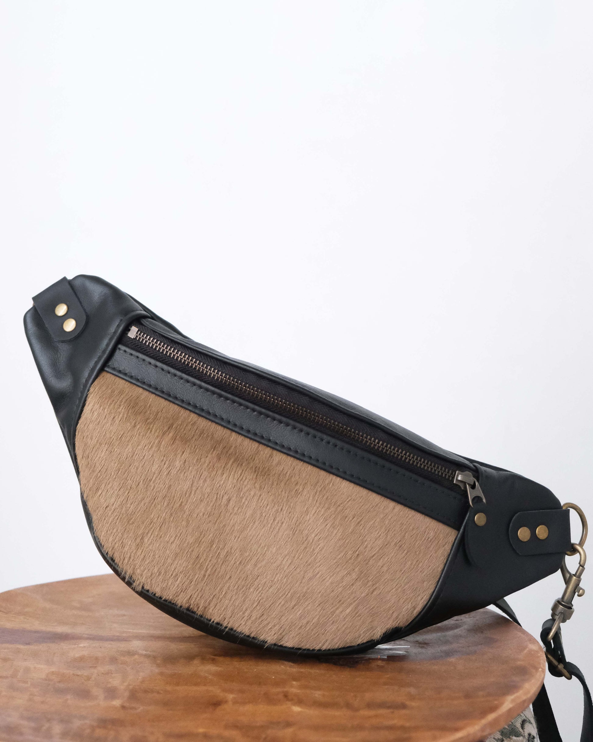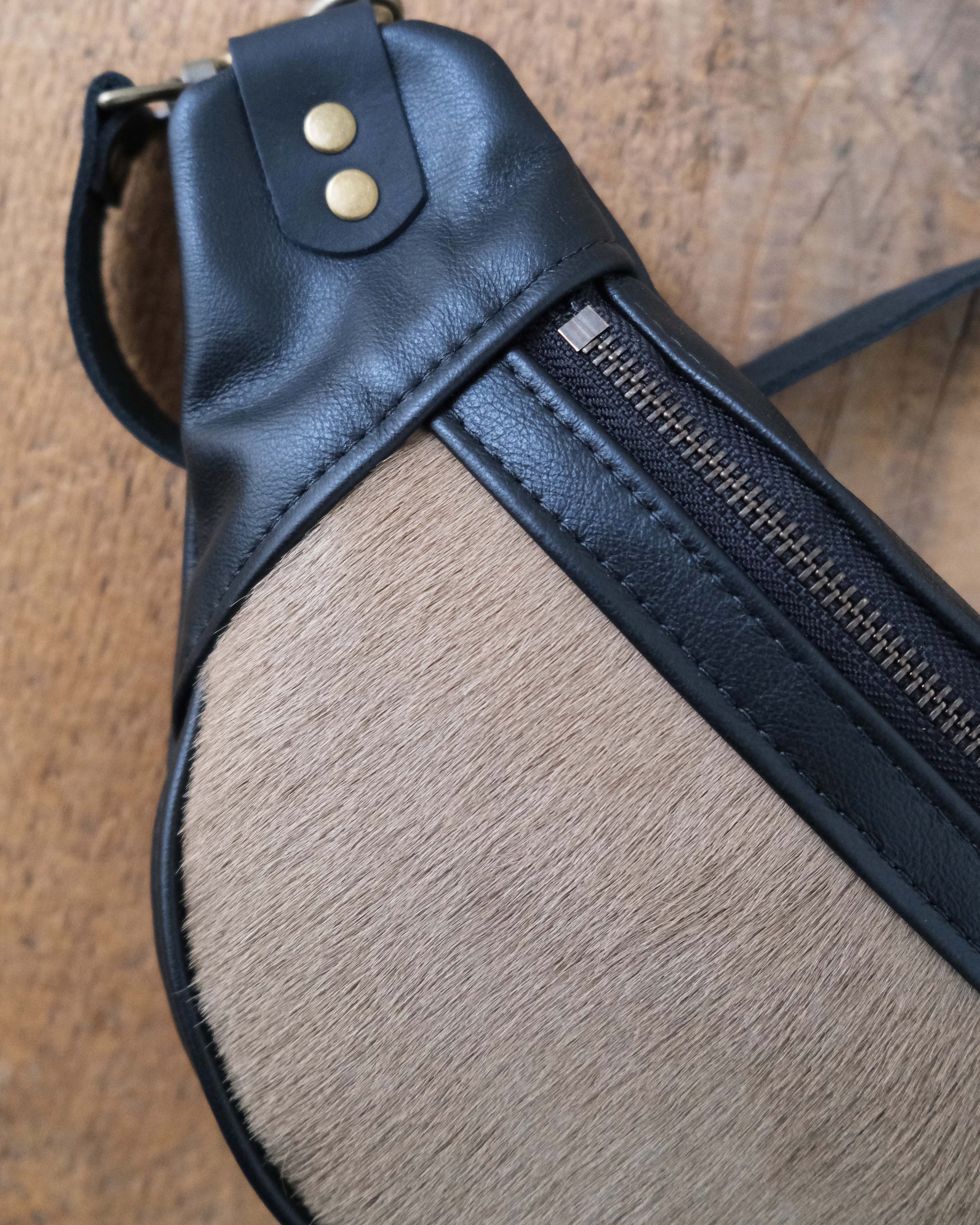 - Front panel is a beautiful hair-on cowhide. The rest of the bag is black Italian leather