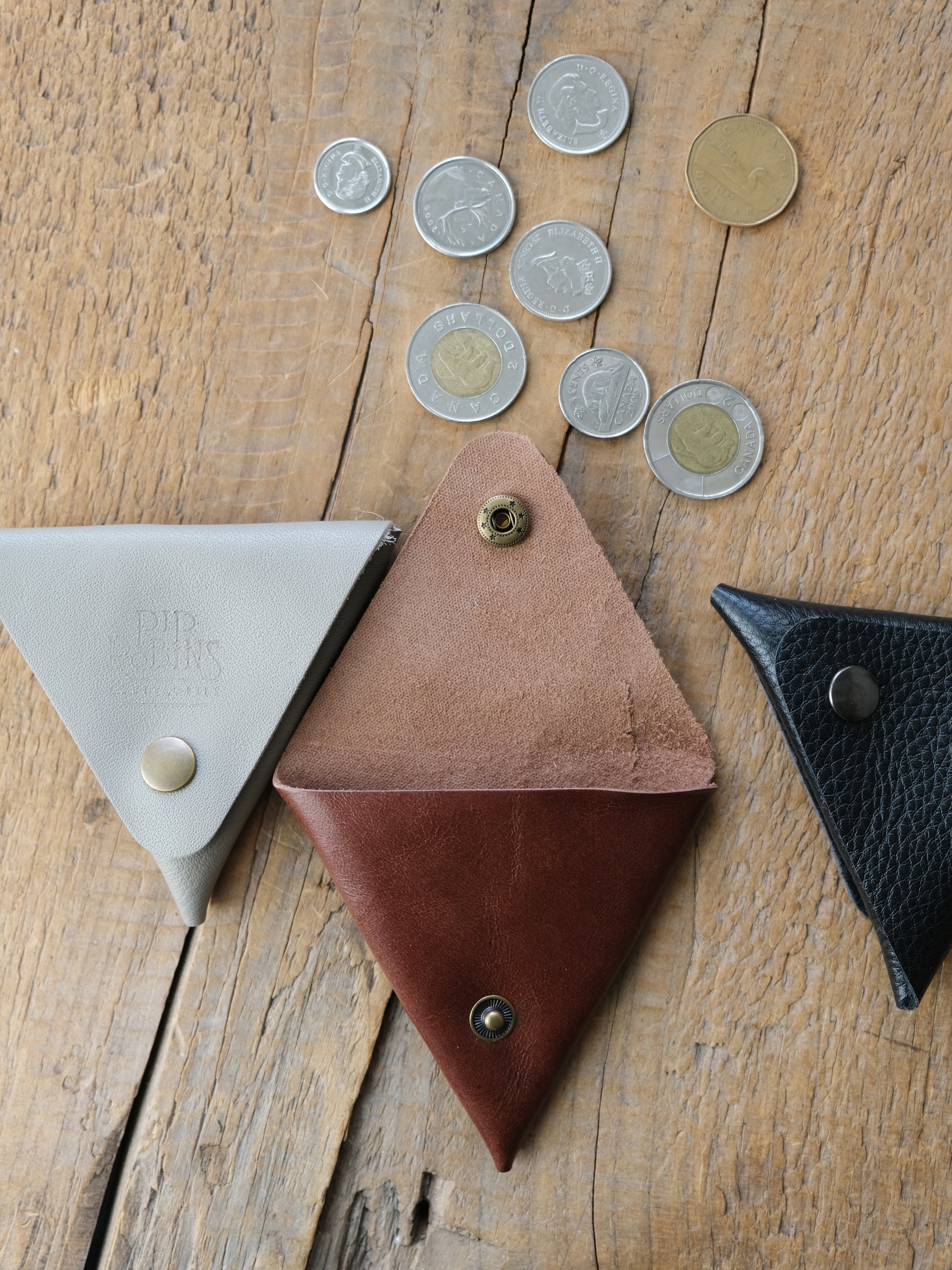 Designed with thoughtful simplicity, this leather pouch starts as one piece and folds into a triangle with two convenient openings—both leading to the same welcoming interior. Whether you're organizing spare change, protecting your earbuds, or keeping guitar picks within reach, this pouch supports your daily needs with understated elegance.